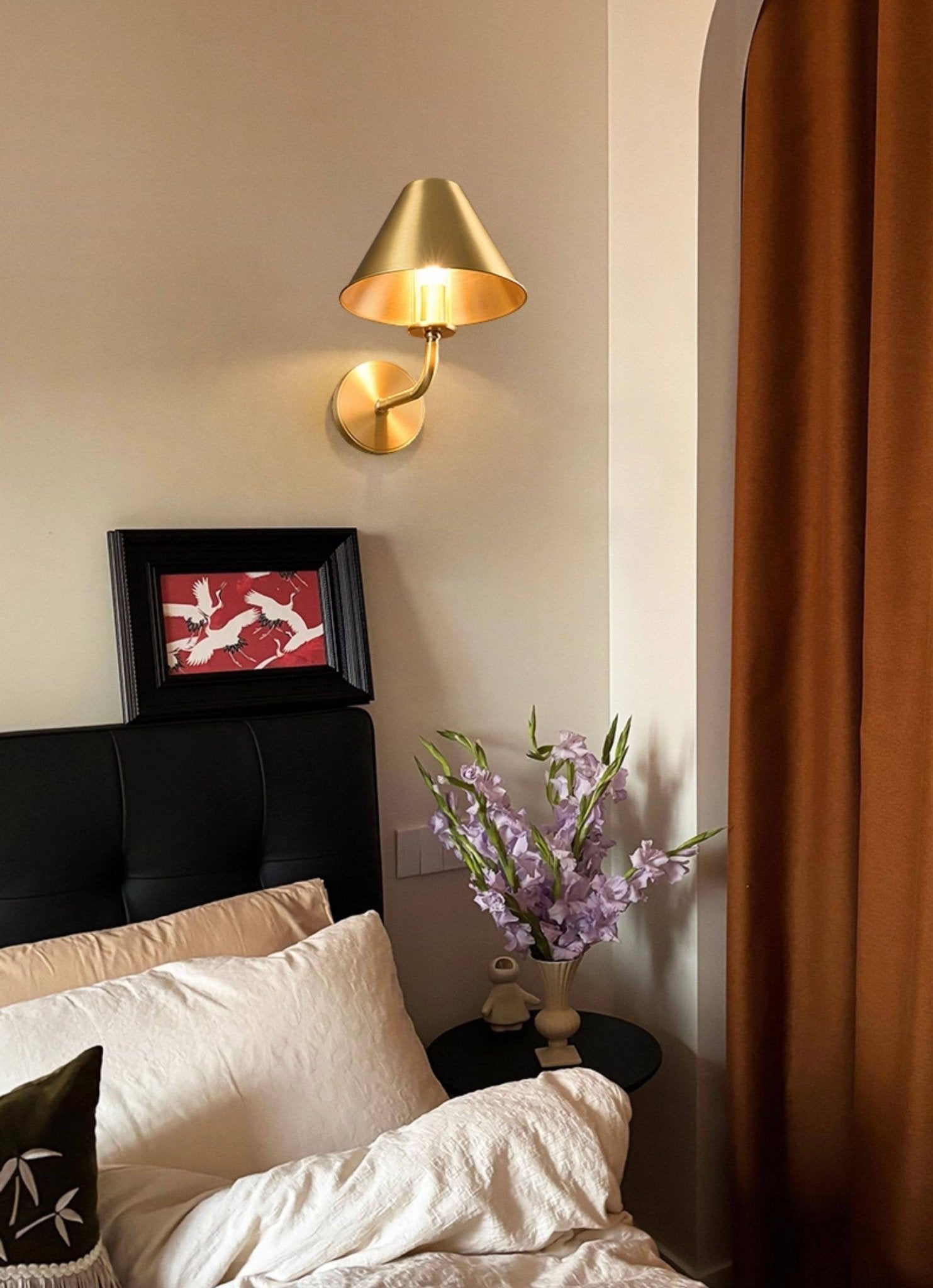 The Kaia Brass Wall Sconce features a refined conical shade paired with a gently curved arm, creating a balanced and timeless wall-mounted design. Crafted entirely from brass, the fixture presents a warm metallic presence that feels both classic and understated.